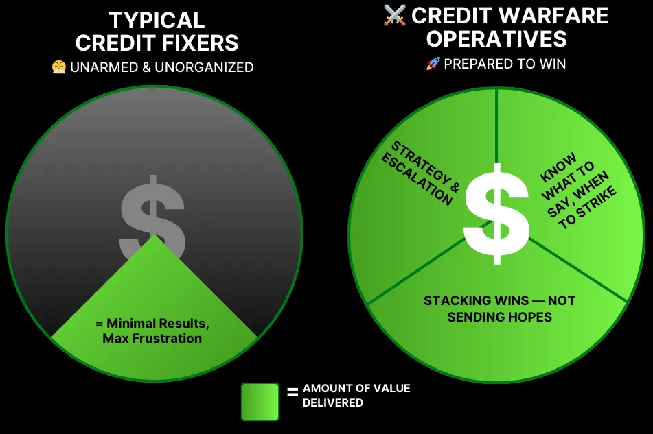 In the past, most people thought their only option was to hire a credit repair company and hope for the best. But here’s the truth — even the best agencies can only do so much if you don’t know what’s really on your reports or how to push the right pressure points. That’s why Credit Warfare™ puts the power in your hands first — so you can understand what’s hurting you, take action immediately, and get faster results.