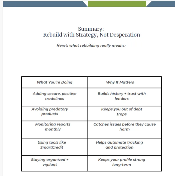 Once the deletions hit, this bonus roadmap shows you exactly what secured cards, builder loans, and AU moves to use to rebuild fast — without triggering more damage.